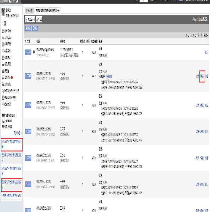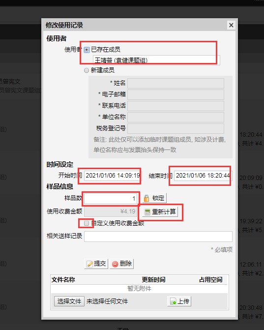 2、对收费结果有疑问需要进行修改,请到界面左正角的“您负责的所有仪器的使用记录”或“您负责的所有仪器的送样记录”,找到相应记录点击编辑。根据实际情况修改相关数据并点击重新计算费用或自定义修改费用金额。后提交即可。