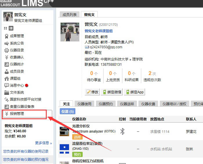 1、课题组负责人登录大型仪器开放共享管理平台(http-dygx-csuft-edu-cn-80.webvpn.csuft.edu.cn),进入报销管理。
