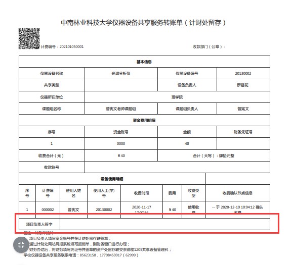 流程:仪器管理员确认收费金额——课题组负责人选择报销项目生成报销单——课题组负责人选择报销单填写资金支出账号后提交打印——课题组负责人通过财务网报系统提交财务处办理转账手续——现代分析测试中心根据财务报账结果进行确认。