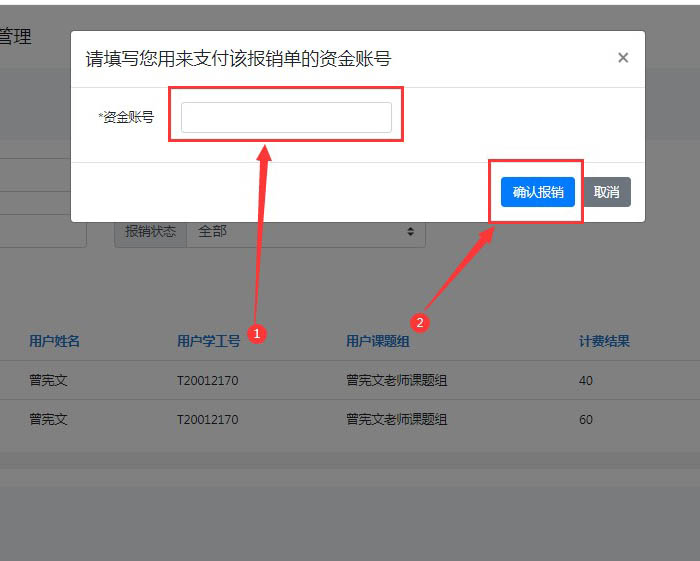 3、在课题组报销单中点击确认报销,在弹出的资金账号中填写本人或他人课题经费账号后确认。